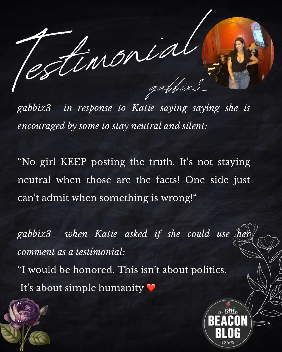 ALBB wrote new ground rules and observations, which you can read above. A beautiful thing happened after that. New self-appointed bouncers appeared in comments while DMs trickled in from people lending their support. New Testimonials of appreciation were written, and ALBB gained another level of understanding of the wide-ranging readership.