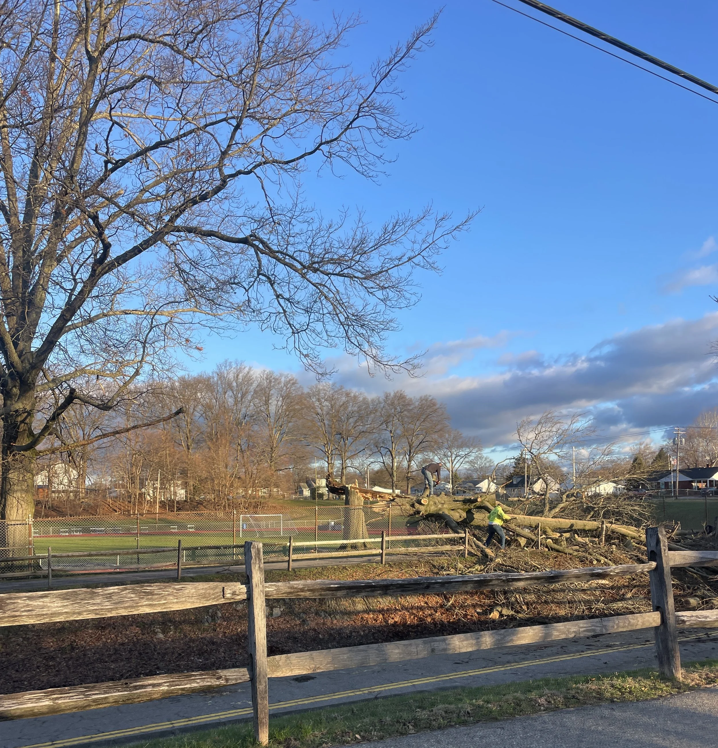 /At long last, one of the large trees on the paved path between the student track and Matteawan Road came down during the violent winds on Monday evening. After most storms involving heavy winds, thick branches from these trees fall onto the path. The branches are moved periodically throughout the day. This tree broke at its base, completely covering the path that students take to school each morning, crushed the fence beneath it, and spilled into the road.
