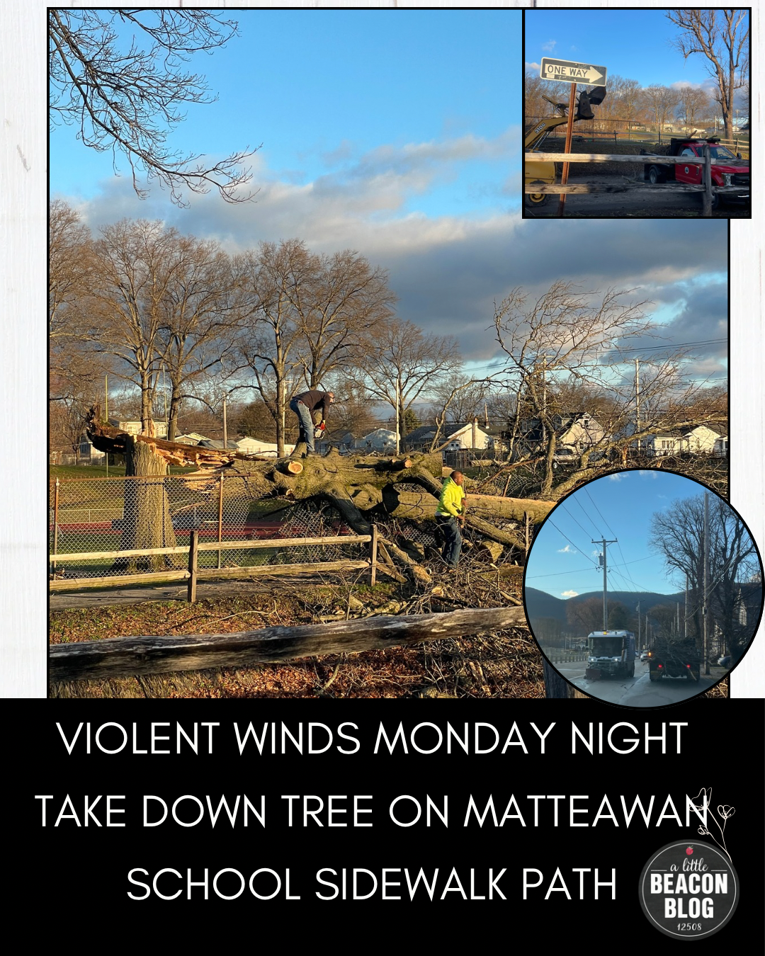 Beacon’s Highway Department responded to the scene to remove the tree on Tuesday morning, blocking school traffic from going down Matteawan Road so that the tree could be carted away in trucks branch by branch, thus causing vehicular confusion at the intersection of Matteawan and Verplanck for parents, grandparents and students driving to school. This is one of the most heavily trafficked areas in Beacon at that hour, as resident vehicles are en route to school, as well as trucks from the Highway and Water Departments to begin their days.