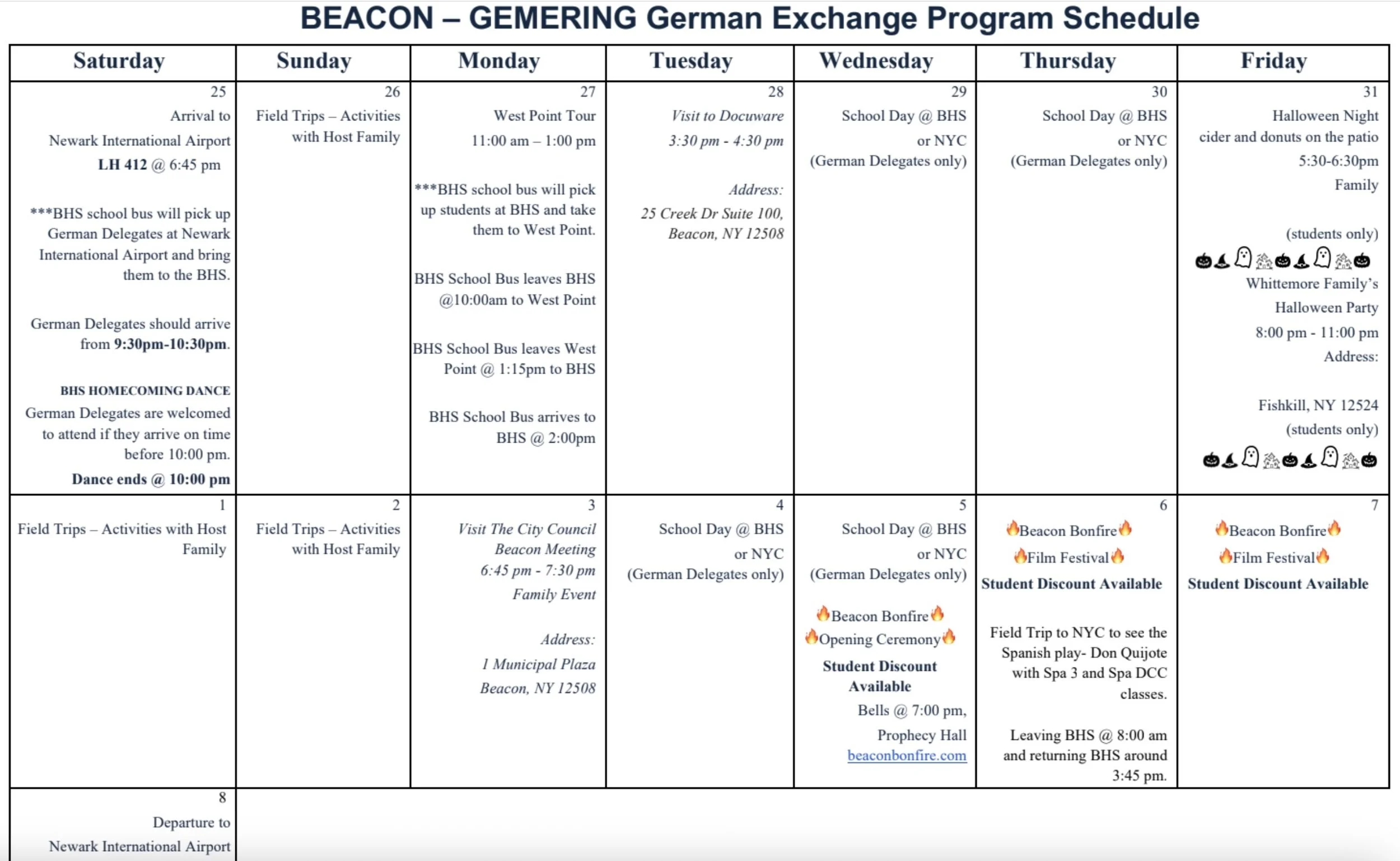 The co-creator of the German exchange program, community organizer and former Beacon High School PTO President, Kelly Ellenwood, explained to ALBB about scheduled social events: “In the past 3 years, there have always been multiple family-sponsored social events planned by the families every year, especially around Halloween, since that is typically when the exchange happens - they visit during an October break in Germany.”